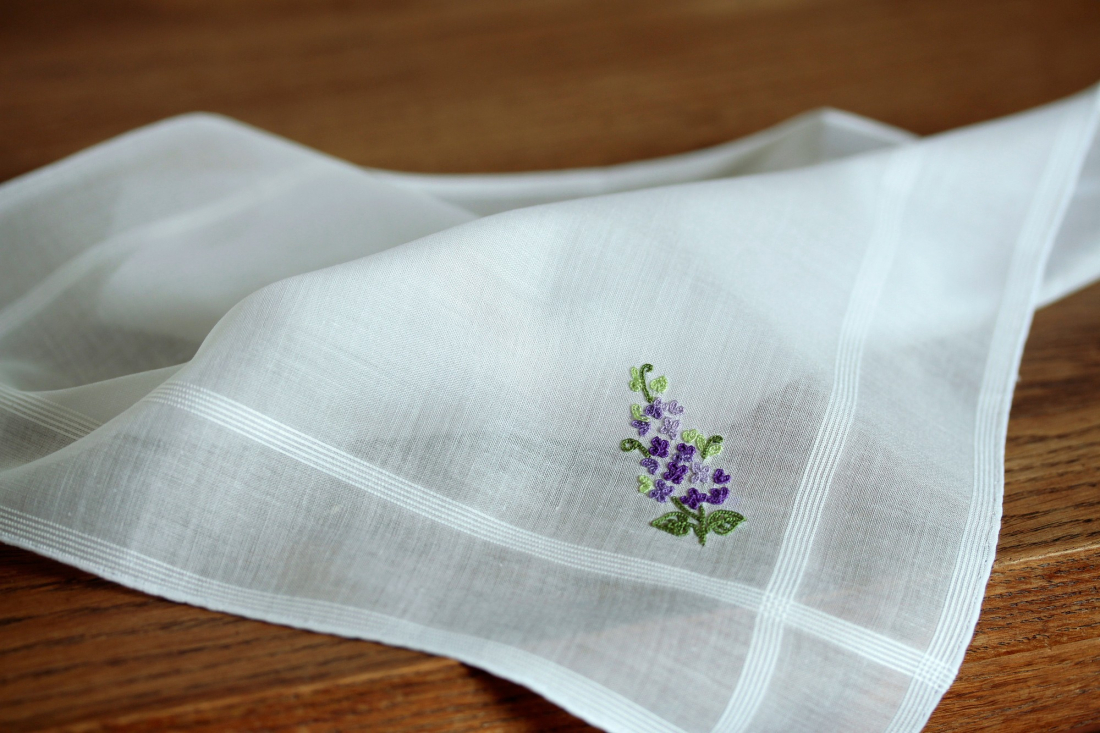Royale ou champêtre, l’émotion qui se dégage de ces mouchoirs est aussi intimement liée à leurs couleurs : blanc et pointe de jaune, camaïeu de violet, aplat d’orange ? Tant de richesses chromatiques s’ouvrent à vous …